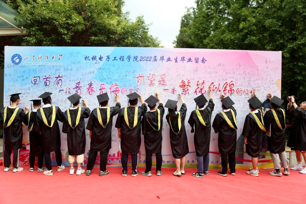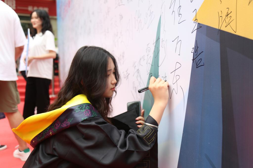 犹记初遇秋风中,忽而相别南风里。在仲夏的阳光里,2022届毕业生们在签名墙上写下自己的姓名,书写对母校的不舍与祝福,与领导、老师、同学们合影留念,鲜花、笑容、掌声定格在了这个弥足珍贵的六月。