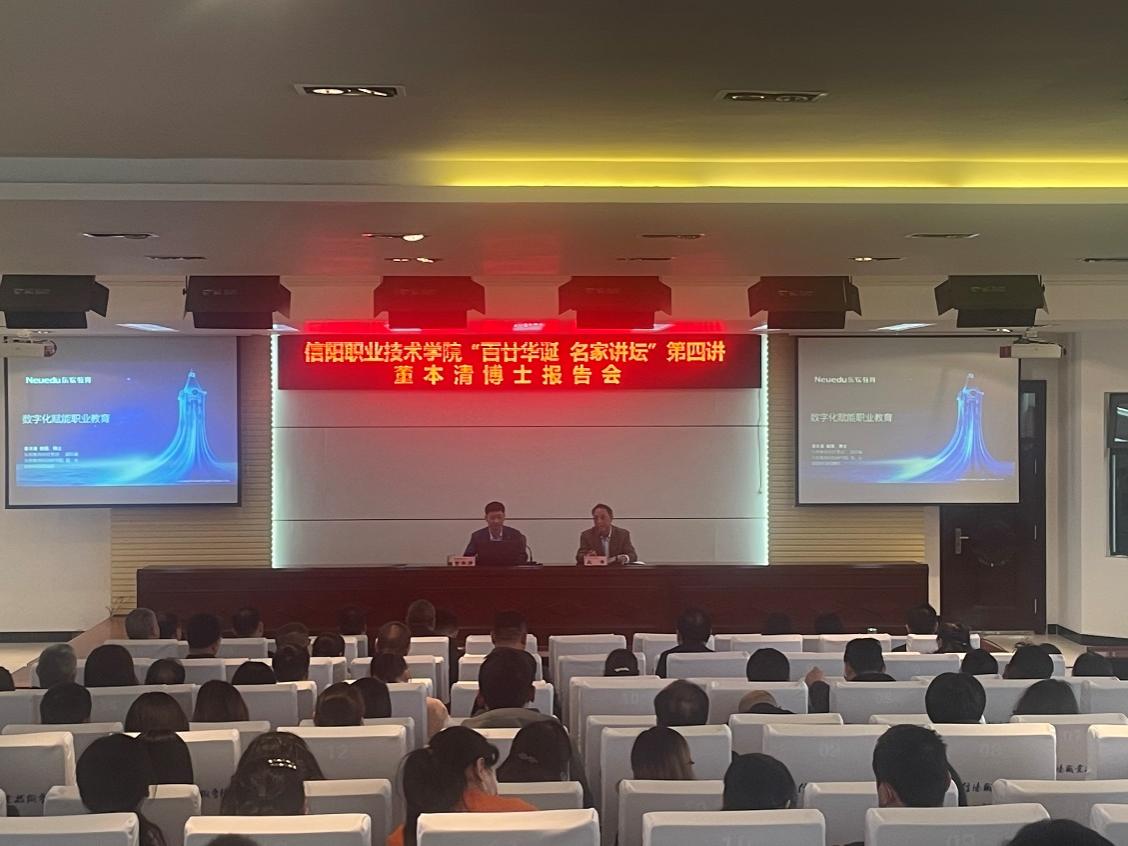 3月28日下午,东软教育科技集团副总裁、东软教育科技研究院院长董本清博士应邀到金年会作了题为《数字化赋能职业教育》的报告会。学校党委书记郑洪涛,副校长王豪、郑延芳、李新毓、教务处处长余磊、党办主任张国锋、金年会院长黄德成、党总支书记严正香等全校副科级以上干部及各教学院部基层教学组织负责人参加了报告会,会议由王豪副校长主持。