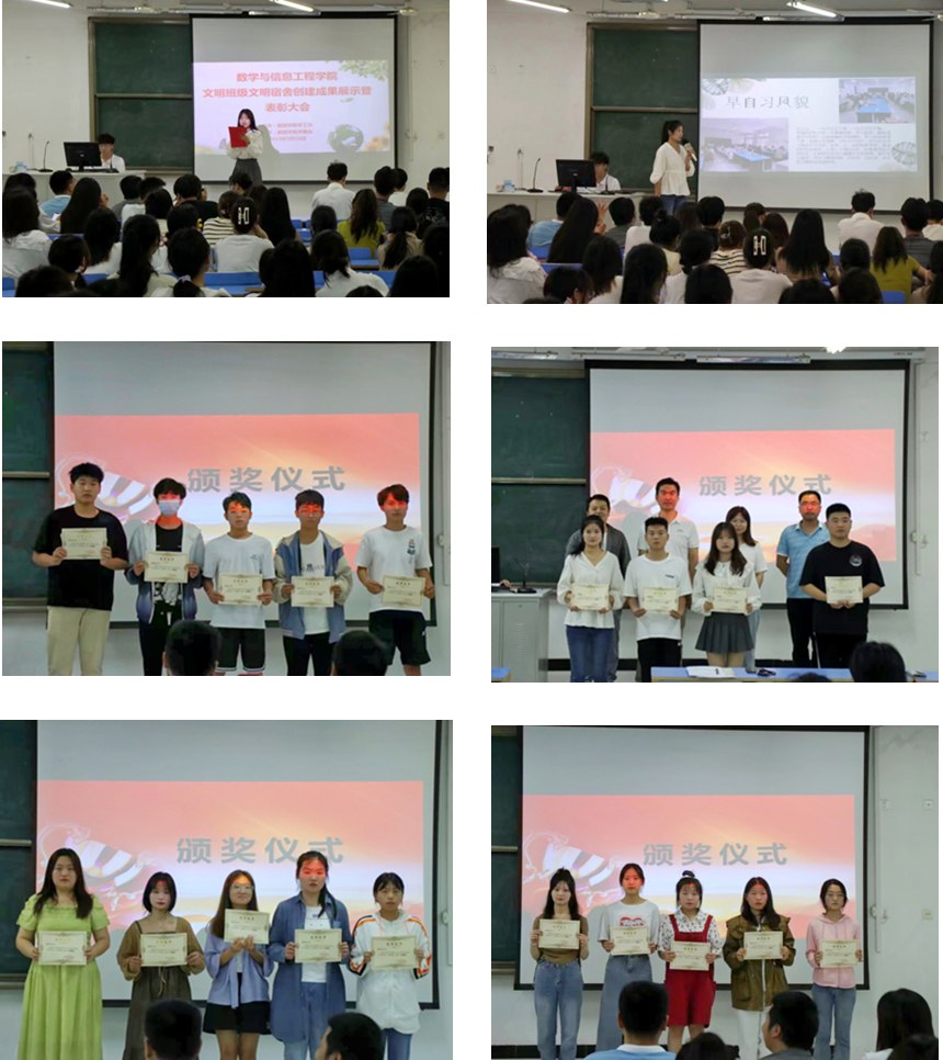 经过学院领导老师抽查和学委会的监督检查,22级数教1班等八个班级被授予“文明班级”荣誉称号,西9114等三十个宿舍被授予“文明宿舍”荣誉称号。大会现场,文明班级代表结合PPT从班级文化特色、班级管理、工作实践等方面进行了成果展示,分享了文明班级创建经验,文明宿舍代表展示了干净整洁、文明向上的宿舍环境,汇报了文明宿舍创建成果,赢得了现场师生的阵阵热烈掌声。