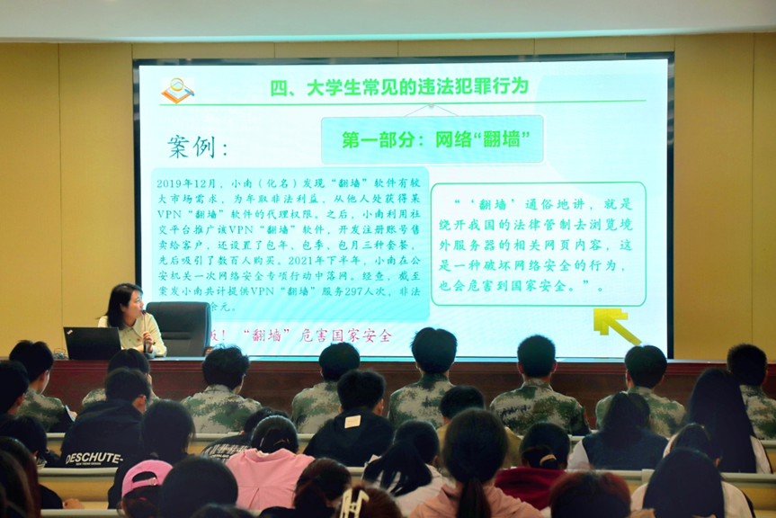 马克思主义学院王博老师以“在法治阳光普照下,做尊法学法守法用法的新青年”为题,围绕“法治社会的内涵”、“遵法守法,做法律上的明白人”、“守法用法,做合格大学生”、“大学生中违法犯罪行为案例”四个方面阐述了法律的重要性以及怎样学会依法办事。王老师以盗窃、诈骗、打架斗殴、网络犯罪等典型案件以案说法,以理释法,详细解读了大学生中常见的违法犯罪行为,让同学们了解了相关法律知识,增强了他们的法治意识、明辨是非能力和自我保护能力。王老师最后强调,学生们要自觉抵制各种不良诱惑,学会拿起法律武器保护自己。