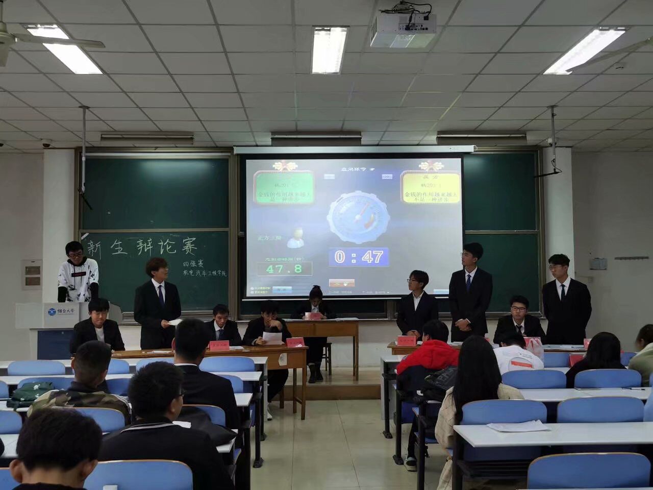 本次比赛分为上、下半区共四场辩论赛。辩题结合时代热点和社会现象,积极引导新生树立正确的价值观,辨析生活之理。比赛伊始,赛事主席为参赛选手介绍比赛规则,随即比赛正式开始。其中,上半区的辩论尤为激烈,双方就“金钱的作用越来越大是不是一种进步”展开激烈角逐。正方所持观点为“金钱的作用越来越来越大是一种进步”,反方观点为“金钱的作用越来越来越大不是一种进步”。首先正方一辩分别从货币、个人、社会三个方面进行陈词立论,逻辑层次清晰,说理透彻,引起台下观众一片掌声。而反方一辩则立足于精神进步论点据理力争,结合现实对正方予以反驳,引用诸多实例,以情动人,让人感同身受。在接下来的自由辩和结辩环节中,双方从物质与精神两个角度分别陈述,紧抓漏洞,你来我往,将本场比赛的氛围推向高潮,其思维的广度与缜密令台下同学佩服。最后,经过评审小组的严格打分,机201-2与机201-6两个班级成功晋级决赛。至此,本次新生辩论赛半决赛圆满结束。