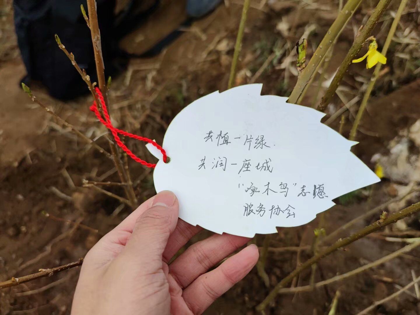 活动伊始,志愿者们于学校青春广场集合,前往华润中心乘坐大巴车至活动举办中心参与动员大会。本次参加植树活动的志愿者来自社会各界,不分年龄不分职位,活动氛围异常活跃。会后,志愿者们意气风发,纷纷下定决心要圆满完成此次任务。随后,各志愿者们再次乘坐大巴车前往养马岛地质公园参与植树。领取了树苗之后,大家找到不同的地点分工协作,挖坑、扶正树苗、填坑、浇水,稚嫩的小树苗植入地下,同时种下的还有一个个绿水青山的梦想。志愿者们在各自种下的小树苗上挂上心愿卡,其中有祝福也有愿望,为本来突兀的山头增添了几分生机。特别是有位小朋友在植树后,在他所植的小树苗旁认真的做着标记,努力的想要记住小树苗的位置,期待未来有一天能再次遇见它。