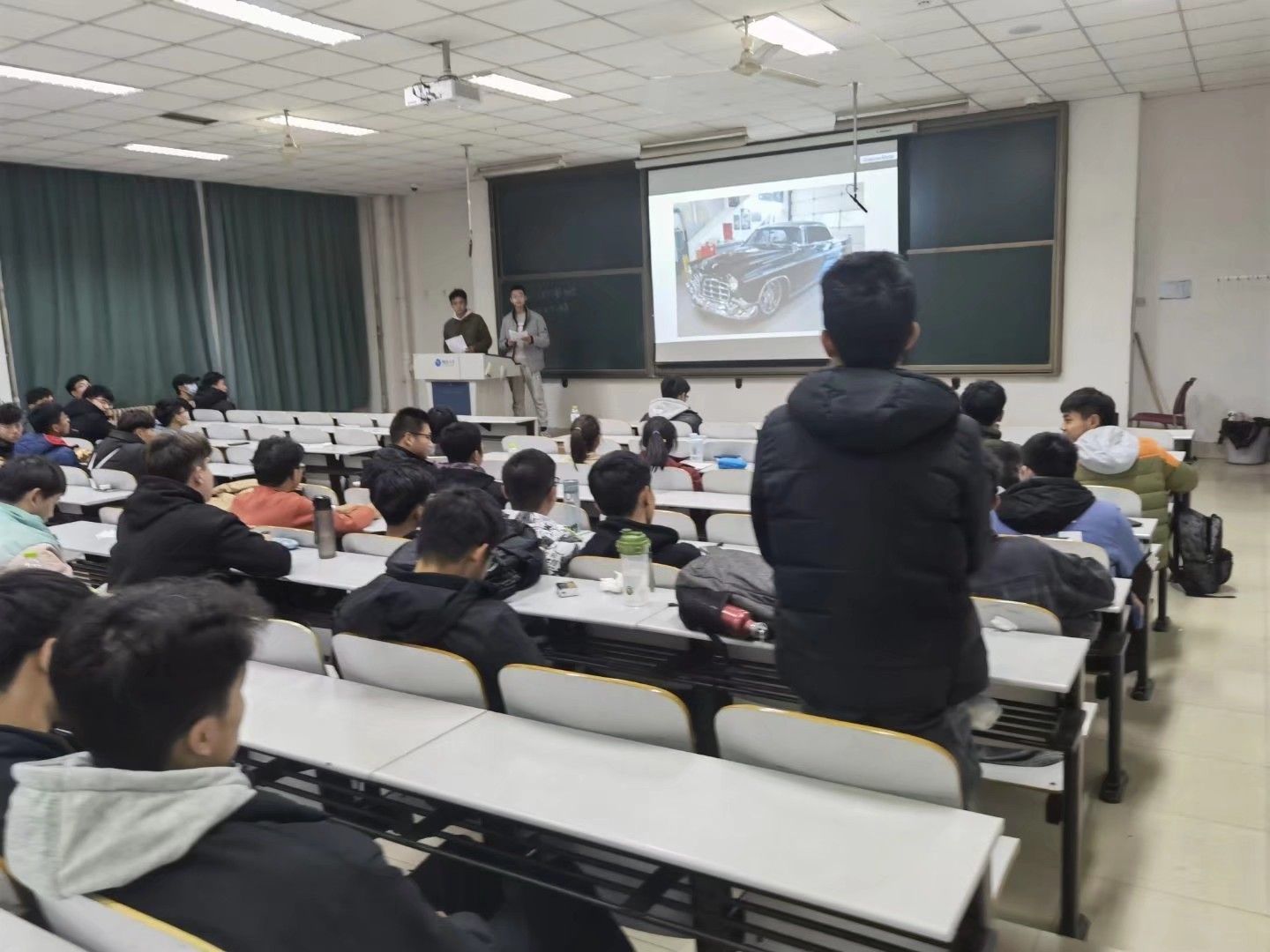 活动伊始,两位主讲人上台,马文泽介绍了本次讲座的内容:国产车。汽车可以分为燃油车和新能源汽车两种,我国的汽车同样生产这两种。通过马文泽的讲解,与会成员认识到,1956年我国制造了第一部“解放牌”载货汽车,结束了中国不能制造汽车的历史。“解放牌”汽车是我国的第一辆燃油车。随着时代的进步,新能源汽车正在飞速发展,通过看视频的方式,李国强给在场成员展示了燃油车和新能源汽车的异同。此次讲座依然有着精彩的问答环节,有成员描述了自己对燃油车和新能源汽车未来的看法,通过同学们的积极回答,使现场氛围达到了高潮。增加了参会成员对国产车的印象,记住更多的讲座内容。最后李国强留下了下期讲座的预告。至此,第四期汽车知识讲座圆满结束。