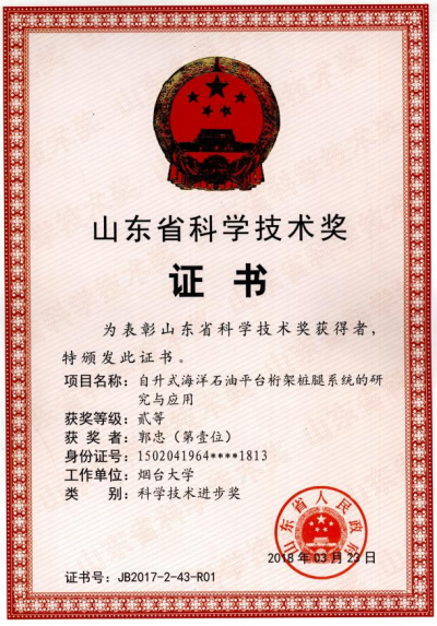 郭忠老师获山东省科技进步二等奖
