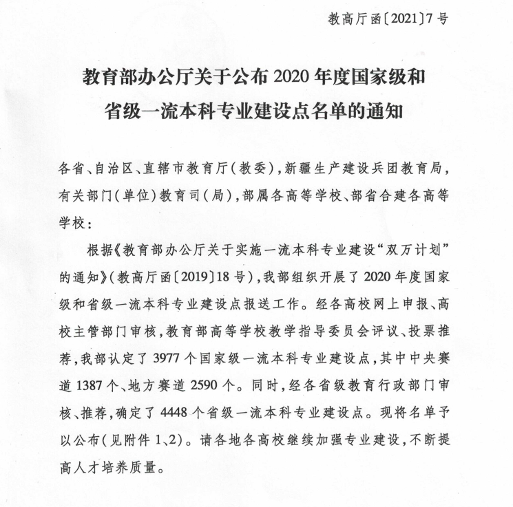 近日,教育部办公厅公布2020年度国家级和省级一流本科专业建设点名单(教高厅函〔2021〕7号),我院机械设计制造及其自动化专业入选2020年度国家级一流本科专业建设点!!!